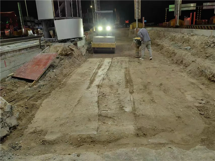 三门峡西收费站四号车道第二层垫层浇筑完成